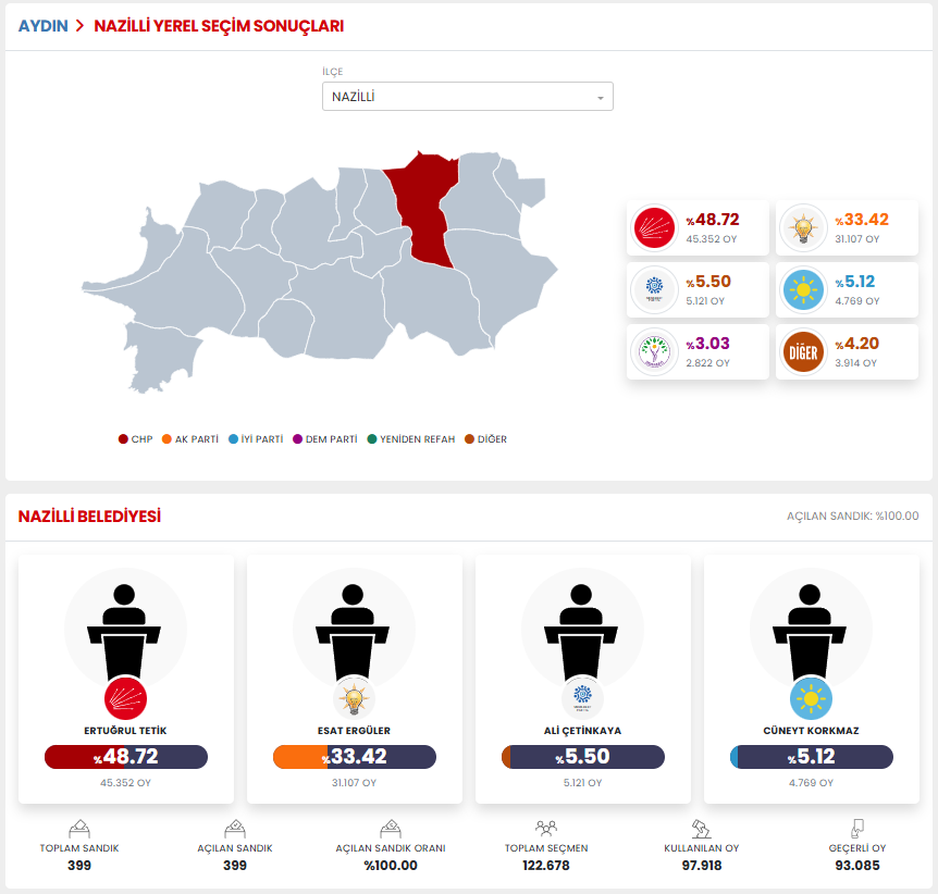 ilçesinin belediye başkanı 2024 yerel seçimleri'nde yüzde 48,72 oy ile chp'li ertuğrul tetik seçilmiştir.