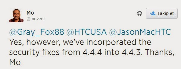 yakın zaman içinde android 4.4.3 güncellemesini alacak telefon, htc one m8... android 4.4.3 güncellemesi ile birlikte android 4.4.4 güncellemesi özelliklerini de kazanacak. ekstra olarak bir üst güncellemeye ihtiyaç duymayacak.